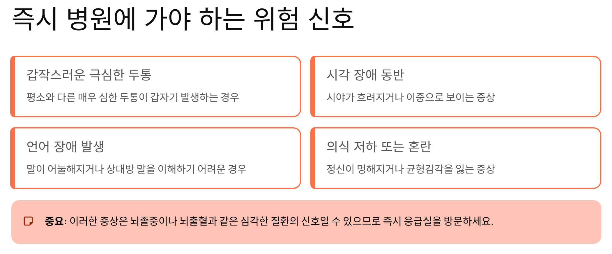 • 갑자기 극심한 두통이 시작됨 (예전에 없던 정도의 통증)