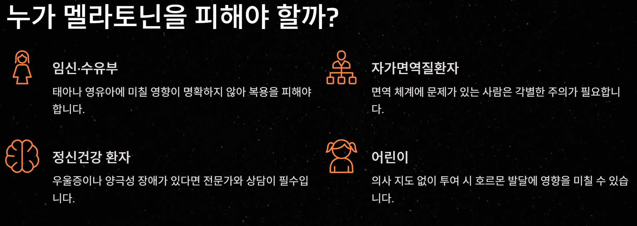 멜라토닌의 효능이 많지만, 모든 사람이 복용해도 되는 것은 아닙니다. 임신 중이거나 모유 수유 중인 여성은 태아나 영유아에 미칠 영향이 명확하지 않아 복용을 피해야 합니다. 또한 자가면역질환이 있거나 면역 체계에 문제가 있는 사람도 주의가 필요합니다.