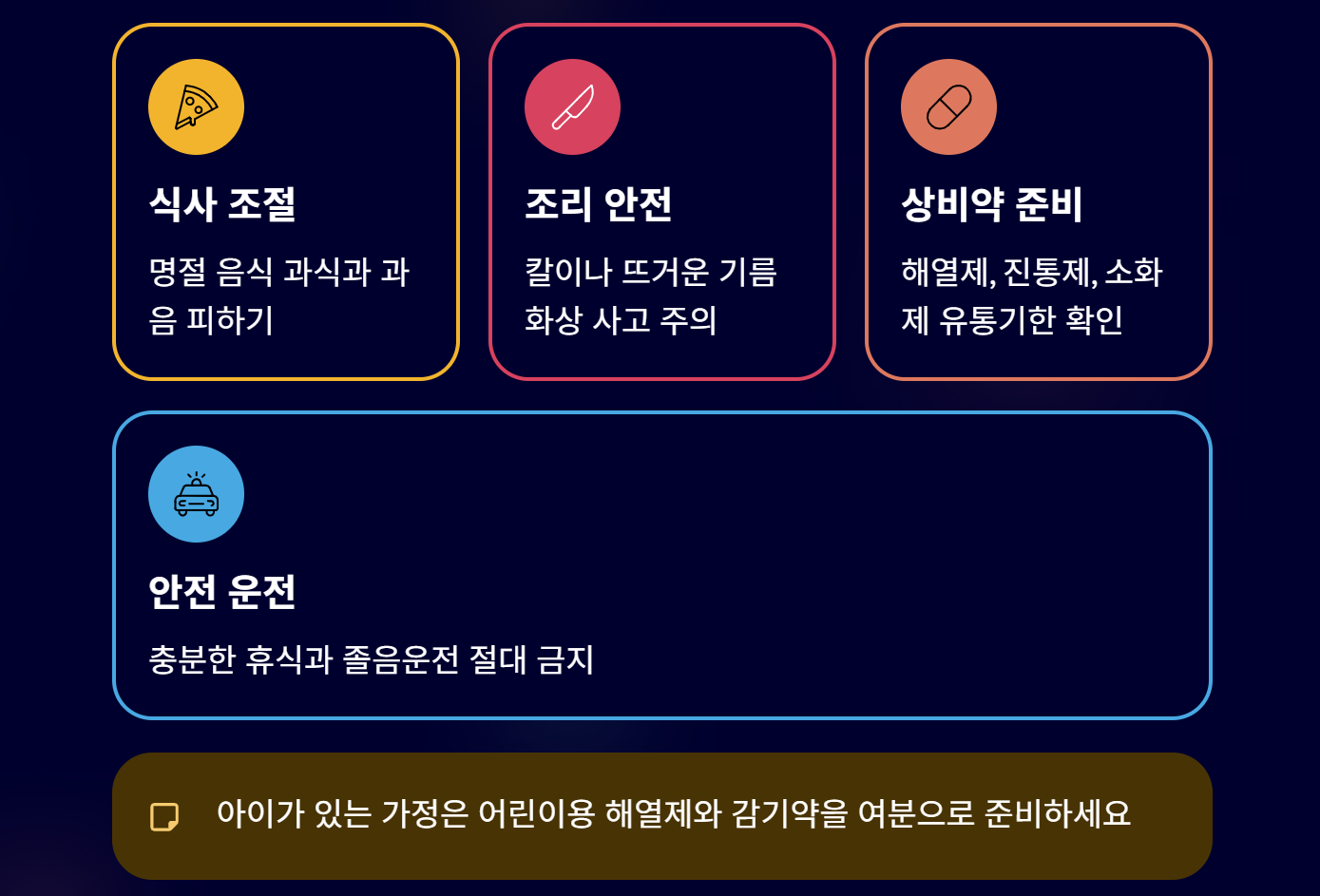 무엇보다 중요한 것은 예방입니다. 명절 음식은 과식하지 않도록 주의하고, 과음도 피해야 합니다. 조리할 때는 칼이나 뜨거운 기름에 의한 화상 사고를 조심하세요.