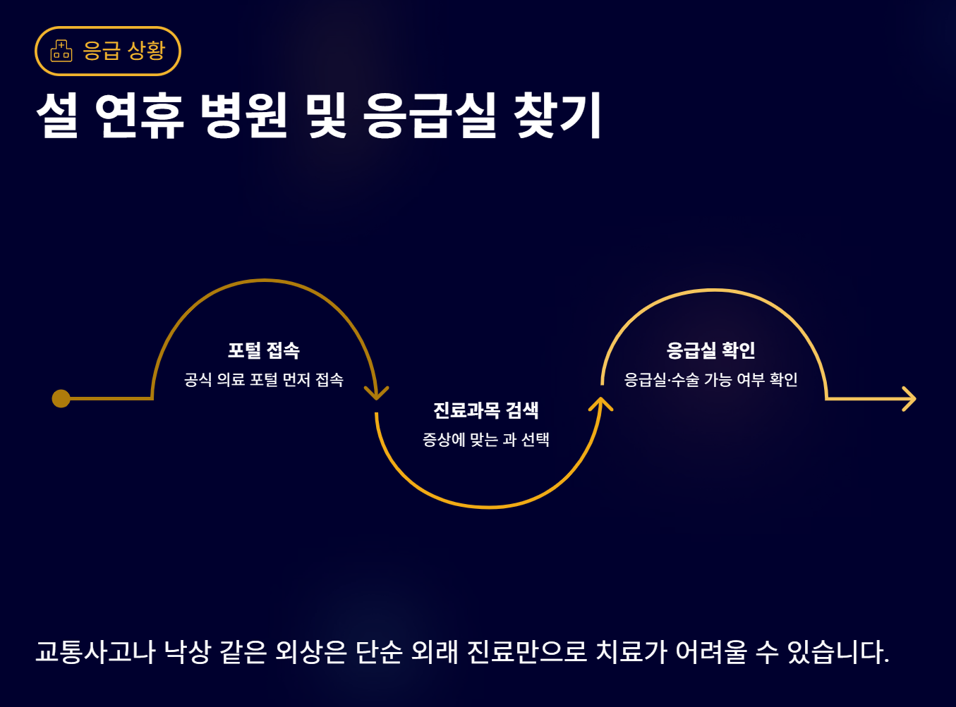 설 명절이 다가오면 가장 걱정되는 것 중 하나가 바로 갑작스러운 건강 문제입니다. 긴 연휴 동안 대부분의 병원과 약국이 문을 닫기 때문에 아프거나 다쳤을 때 어디로 가야 할지 막막한 경우가 많은데요. 오늘은 설 연휴 기간 병원, 약국, 응급실을 찾는 방법을 총정리해 드리겠습니다.