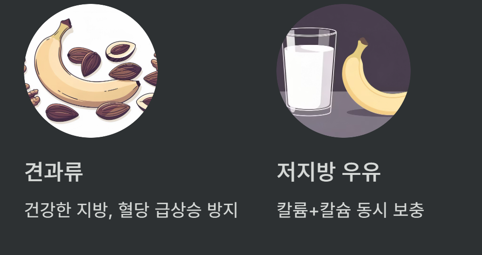 오트밀은 바나나와 함께 풍부한 섬유질을 제공하면서 콜레스테롤 배출까지 돕습니다. 견과류(아몬드, 호두 등)를 곁들이면 건강한 지방과 단백질을 보충해서 포만감을 높이고 혈당 급상승을 막아줍니다.