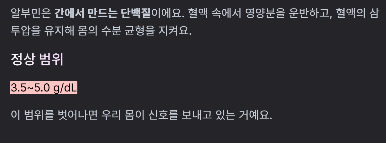 알부민은 우리 간에서 만드는 단백질이에요. 혈액 속에 풍부하게 있으면서 영양분을 운반하고, 혈액의 삼투압을 유지해서 몸의 수분 균형을 지키는 역할을 하죠. 일반적으로 혈액 검사에서 알부민 수치가 3.5에서 5.0g/dL 정도면 정상 범위로 봐요. 그런데 이 수치가 이보다 낮다면 우리 몸이 뭔가 신호를 보내고 있는 거라고 생각하면 돼요.