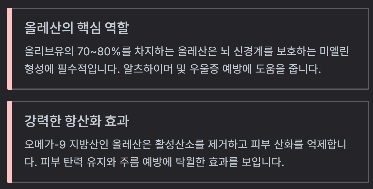2023년 스페인 세비야 대학교의 연구진이 발표한 연구에 따르면, 올리브유의 70에서 80%를 구성하는 올레산은 노년기 인지 기능 저하를 효과적으로 예방할 수 있습니다. 연구진은 올레산이 뇌의 인지질을 구성하는 주요 성분임을 확인했습니다.