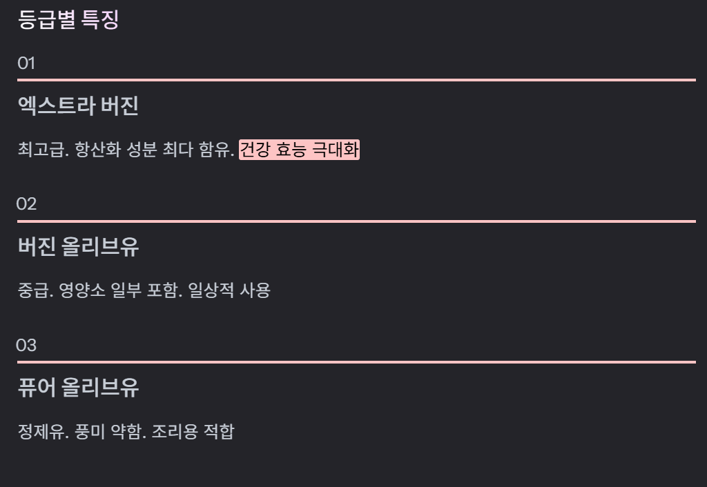 올리브유의 효능을 제대로 누리려면 제품 선택이 매우 중요합니다. 올리브유는 등급에 따라 엑스트라 버진, 버진, 퓨어 올리브유 등으로 나뉘는데, 효능을 원한다면 엑스트라 버진 올리브유를 선택하는 것이 좋습니다. 엑스트라 버진 올리브유는 올레오칸탈과 폴리페놀 같은 항산화 성분이 가장 풍부하게 함유되어 있기 때문입니다.