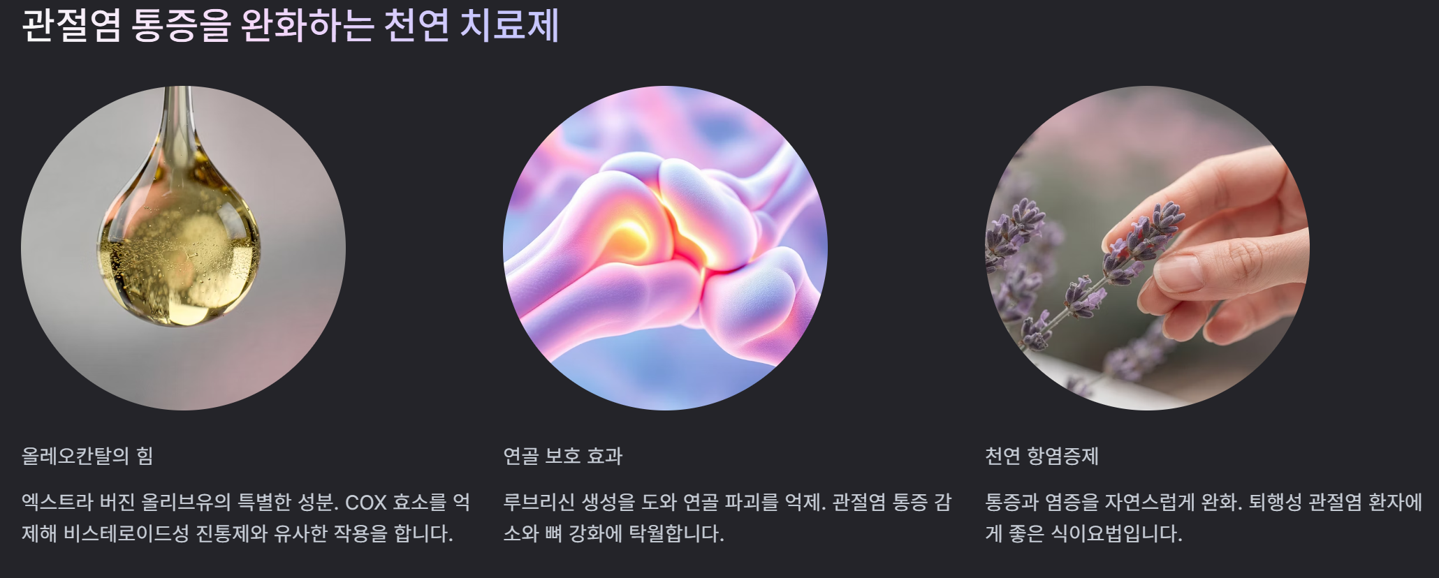 올리브유는 항염증 작용이 매우 뛰어난 식재료로 널리 인정받고 있습니다. 특히 엑스트라 버진 올리브유는 올리브를 저온에서 압착해 처음 얻은 기름으로, 올레오칸탈이라는 천연 화합물을 함유하고 있습니다. 올레오칸탈 성분은 통증과 염증을 유발하는 COX 효소를 억제하는데, 이는 비스테로이드성 소염 진통제와 유사한 작용을 합니다. 때문에 올레오칸탈은 천연 진통제이자 항염증제로 불리기도 합니다.