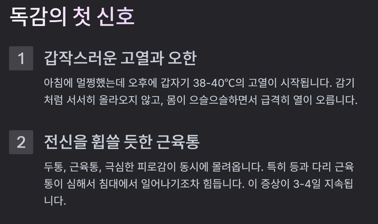 독감이 무서운 이유는 증상이 갑자기 나타나고 매우 심하다는 것입니다. 감염 후 1~4일 만에 급속도로 악화됩니다.