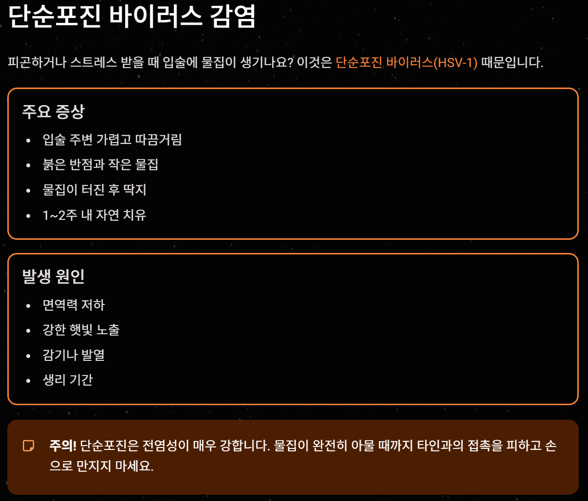특징: 바이러스성 감염이기 때문에 전염성이 있으며, 재발 가능성도 높습니다