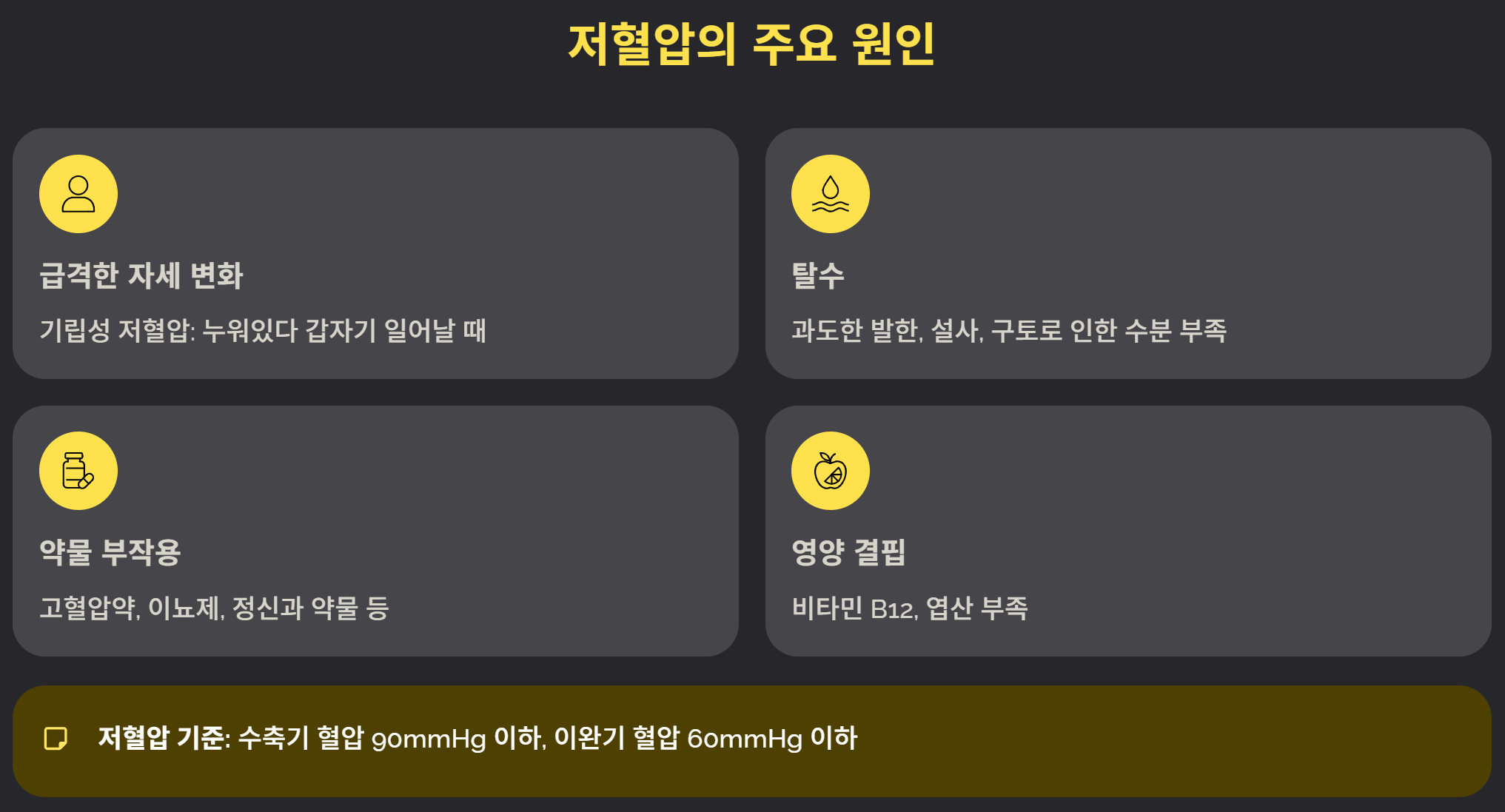 본 글은 일반적인 건강 정보 제공을 목적으로 작성되었으며, 의학적 진단이나 치료를 대체할 수 없습니다. 저혈압 증상이 의심된다면 반드시 의료 전문가의 상담을 받으시기 바랍니다.