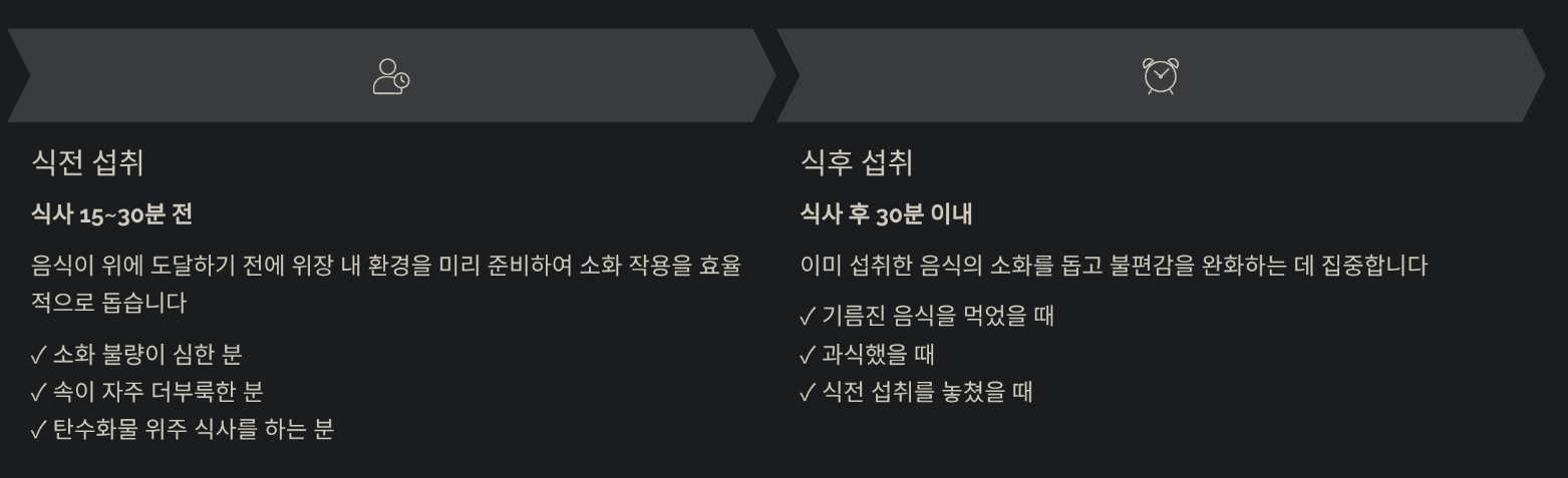 평소 소화 불량이 심하거나 속이 자주 더부룩한 분, 또는 탄수화물 위주의 식사를 즐겨 하는 분들에게는 식전 섭취가 가장 효과적입니다.