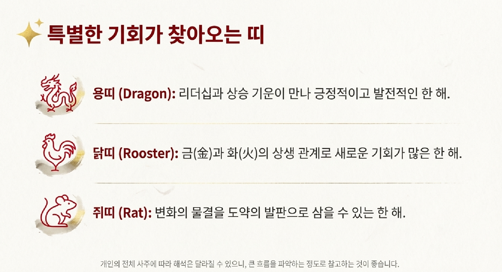 - 닭띠: 금과 화의 상생 관계로 기회가 많은 한 해