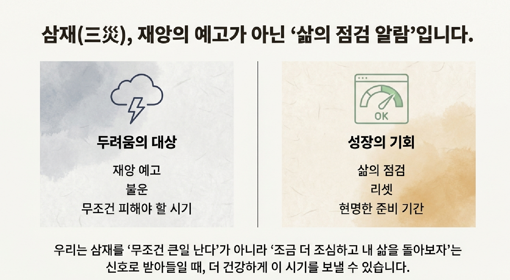 그래서 2026년이 복삼재(눌삼재)라고 해서 "이 해는 끝장이다"라고 받아들이기보다는, 다음과 같이 생각하는 것이 훨씬 현실적입니다: