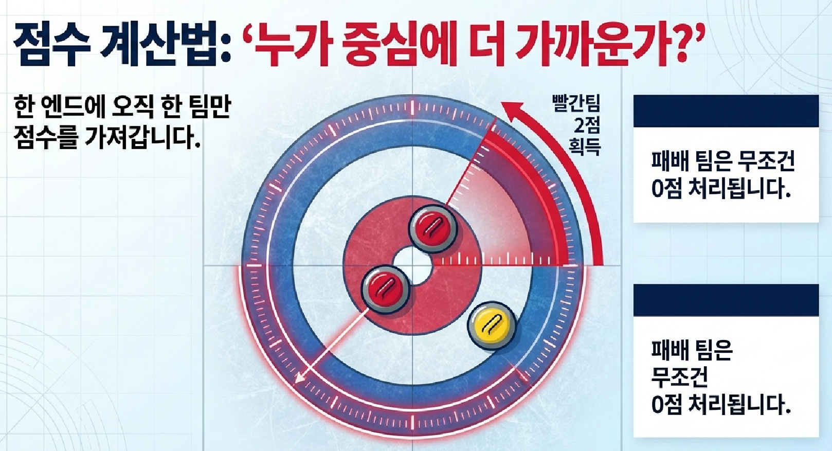 상대팀의 가장 안쪽 스톤보다 가까운 자신 팀의 스톤 개수만 점수로 인정되며, 상대팀은 무조건 0점입니다.
